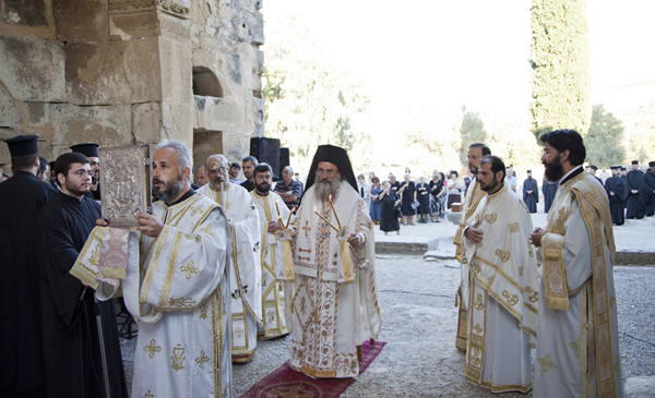 Από τη Θ. Λειτουργία της πρώτης ημέρας του Συνεδρίου, επί τη ι. μνήμη του Αγ. Ιωάννου του Ξένου του εκ Σίβα Μεσαράς, στον Ι. Ν. Παναγίας Κεράς ή Αγ. Τίτου, στην Αρχαία Γόρτυνα. 20-9-2012. Έψαλε ο χορός ψαλτών «Οι Κρήτες Μαΐστρες», υπό την διεύθυνση του Α. Πλαΐτη, Καθηγητή Μουσικής.