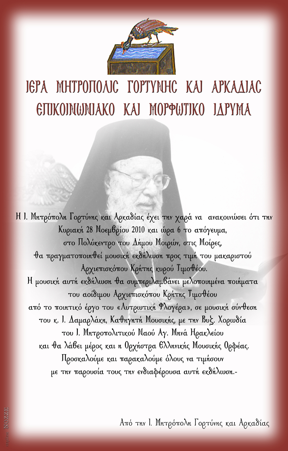 Από την μουσική εκδήλωση της Ι. Μητροπόλεώς μας, 28-11-2010, στο Πολύκεντρο του Δήμου Μοιρών, εις μνήμην του μακαριστού, από Γορτύνης και Αρκαδίας, Αρχιεπισκόπου Κρήτης κυρού Τιμοθέου.