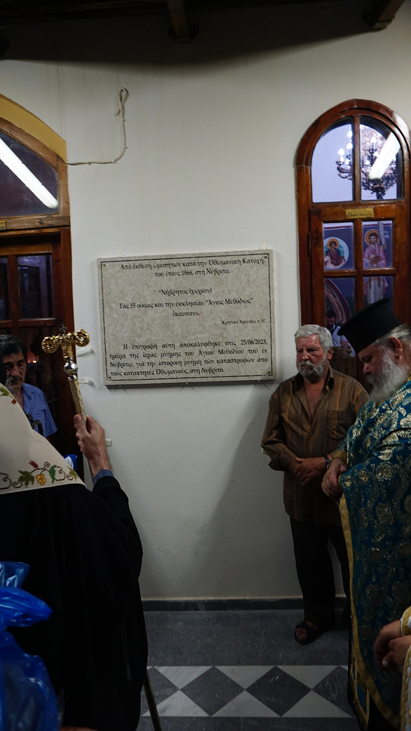 Ἡ ἐπιγραφὴ αὐτὴ ἀποκαλύφθηκε στὶς 25/06/2023, ἡμέρα τῆς ἱερᾶς μνήμης τοῦ Ἁγίου Μεθοδίου τοῦ ἐν Νυβρίτῳ, γιὰ τὴν ἱστορικὴ μνήμη τῶν καταστροφῶν ἀπὸ τοὺς κατακτητὲς Ὀθωμανοὺς, στὴ Νύβριτο.